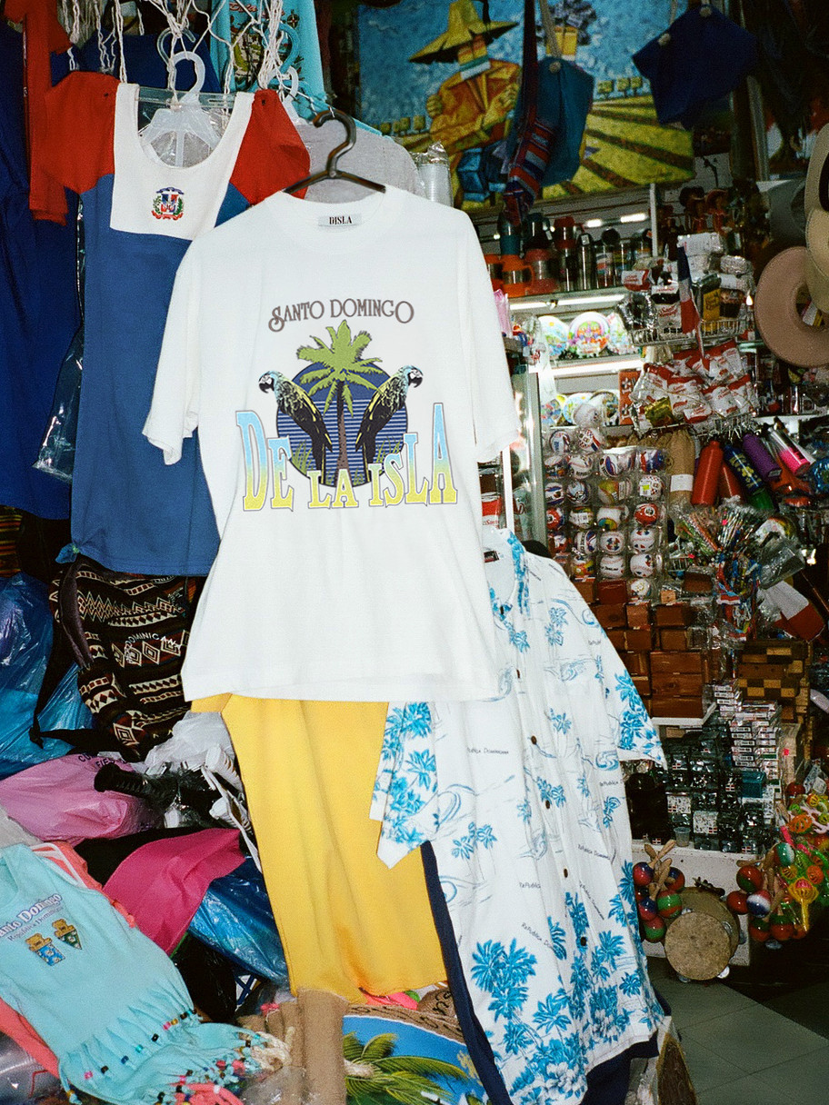 Inspired by vintage souvenir tees of the 90's, the De La Isla T-shirt is a celebration of heritage, memory, and home. Co-designed by siblings Armani and Chanel Disla, this piece honors cultural pride and the immigrant stories of their parents and the many families who make up their community in Lawrence, MA, known as “the city of immigrants.”